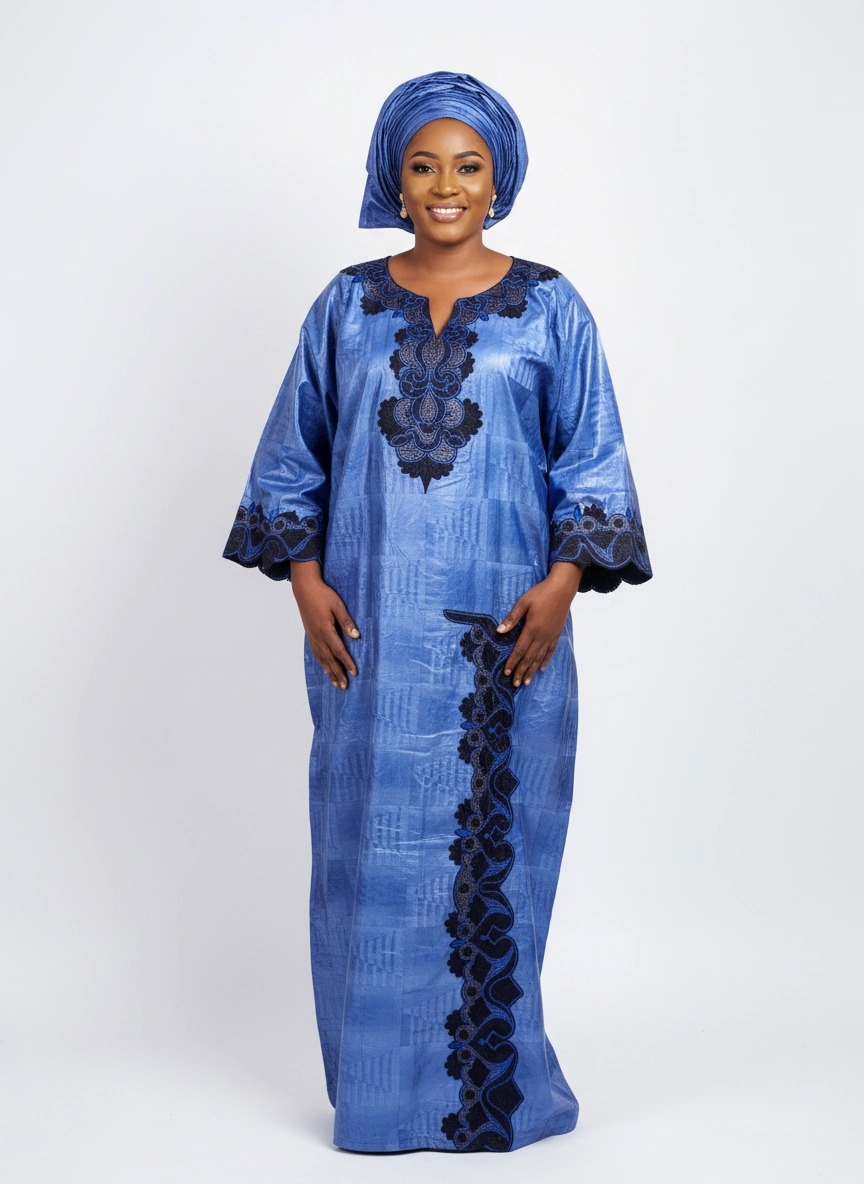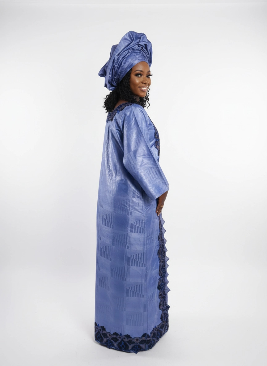 Découvrez une pièce d’exception signée ZeinabBoutik. Cette robe en Bazin Riche, d’un bleu profond et noble, est l’alliance parfaite entre tradition ancestrale et raffinement contemporain.